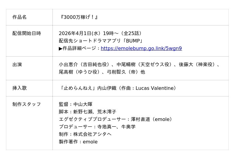ショートドラマアプリ「BUMP」を運営する emole株式会社(本社:東京都目黒区、代表取締役:澤村直道、以下 emole)は、BUMPオリジナルショートドラマ『3000万稼げ!』が、配信開始からわずか1週間でSNS総再生数3,000万回を突破し、BUMP内の週間ランキングおよび24時間ランキングの両方で1位を獲得したことをお知らせいたします。