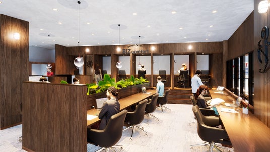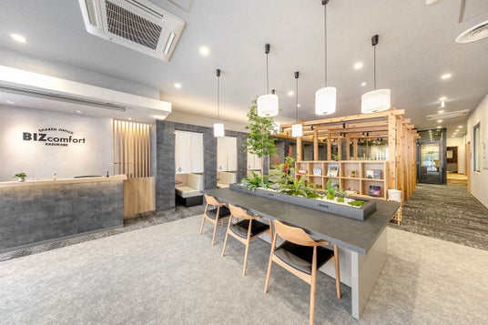 ■BIZcomfort春日部木が連なる梁型のフレームや木目、漆喰などの自然素材感が「和み」の空間を演出。席ごとのデスク幅を広くとった、落ち着きのある作業スペースが好評。