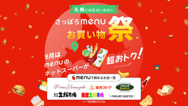 この度、日本発のフードデリバリー・テイクアウトサービス「menu」では、 「東光ストア」 や「ヴィノスやまざき」など、新加盟店が続々と登場している札幌エリアをさらに盛り上げるため、menuのネットスーパーがお得になる「さっぽろmenuお買い物祭」を開催いたします。