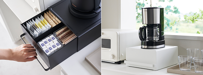 引き出し付きでスティックシュガーや紅茶パックなどの細々としたものが収納可能。中が見えないので生活感を感じさせません。
