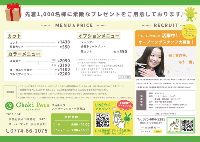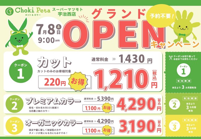 美容室チェーンを300店舗以上展開する株式会社アルテ サロン ホールディングス(横浜市中区/代表取締役社長 吉村 栄義)のグループ会社である株式会社 ニューヨーク・ニューヨーク(京都市伏見区/代表取締役社長 小崎 昌平)は、チョキペタ スーパーマツモト宇治西店を2023年7月8日(土)にオープンいたします。