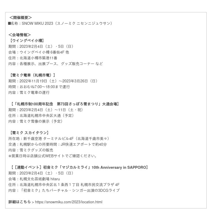 最新情報は、『SNOW MIKU 2023』公式WEBサイトや「雪ミク」公式Twitterアカウントでお知らせいたします。2023年の冬も盛りだくさんの内容で北海道を盛り上げて参りますのでぜひご期待ください。