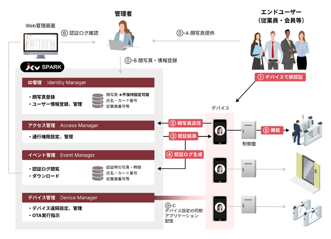 「JCV SPARK」は、自社開発のコンピュータビジョン・クラウドプラットフォーム「JCV Cloud」内で提供するソリューションの1つとなり、顔認証アクセスマネージャーとして機能します。