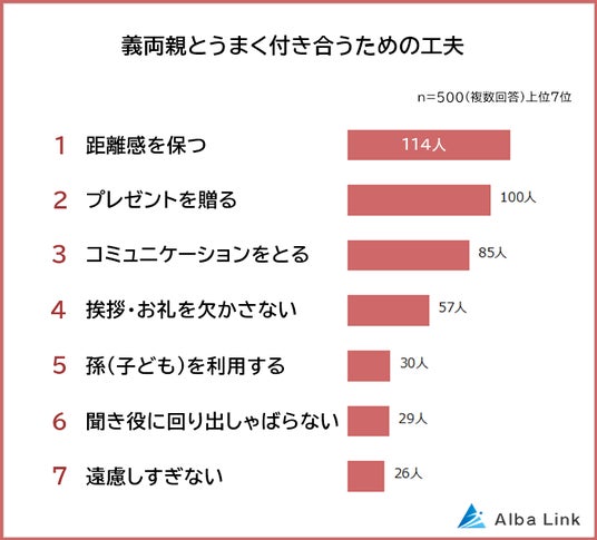 株式会社AlbaLink(本社:東京都江東区、代表取締役:河田 憲二)は、既婚者500人を対象に「義両親との関係に関する意識調査」を実施し、そのデータをランキングにしました。