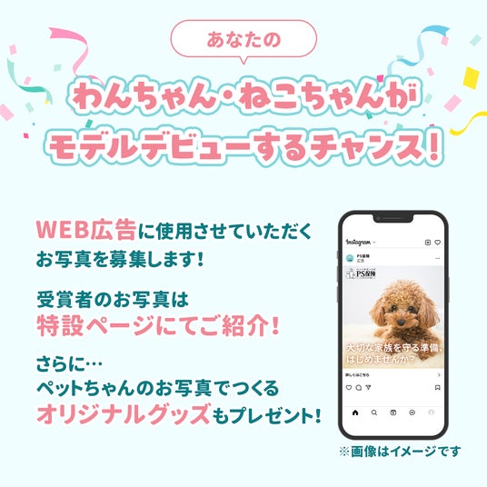 ご応募いただいた写真の中から、わんちゃん部門とねこちゃん部門でそれぞれ最優秀賞と入賞作品を選出し、ペットメディカルサポート「PS保険」のWEB広告モデルとして採用させていただきます。
