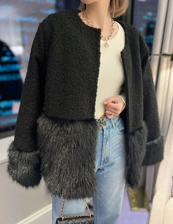 肌当たりなめらかな風合いが魅力のフェイクファーを使ったアウター。 フェイクリングウールと、フェイクファー素材の切り替えデザインが印象的なノーカラージャケットは、羽織るだけでぐっとエレガントな雰囲気に。