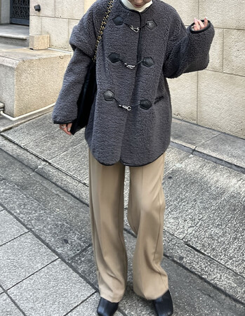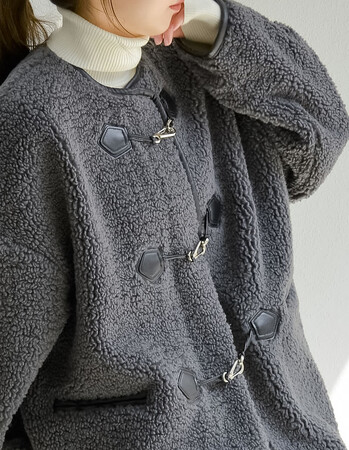 ふんわり暖かみのある風合いが魅力のボアコート。 フェイクレザーのパイピング使いで、甘すぎずモードカジュアルな雰囲気を楽しむのが今年風。