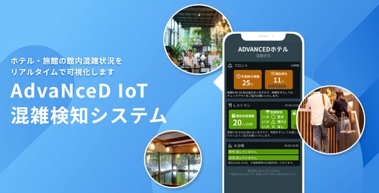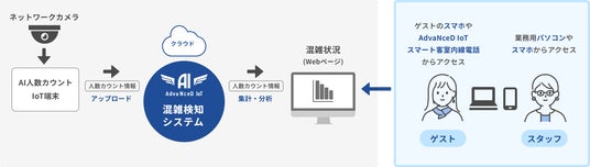 AdvaNceD IoT混雑検知システムは、AIネットワークカメラで検知した宿泊施設内のレストランや大浴場などの混雑状況を、インターネット経由で確認できるシステムです。ゲストのスマートフォンや業務用パソコンから、リアルタイムの混雑状況を簡単に確認できます。
