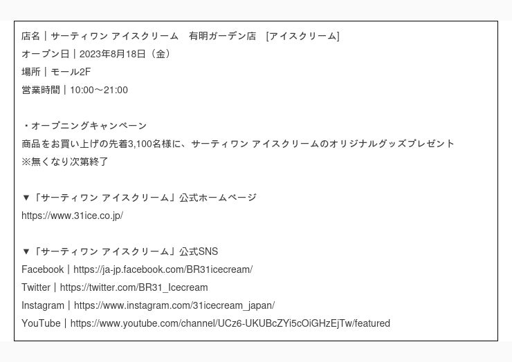 住友不動産商業マネジメント株式会社(本社:東京都新宿区 取締役社長:山本 直人)が運営する商業施設「住友不動産 ショッピングシティ 有明ガーデン」(所在:東京都江東区)の新規店舗をお知らせいたします。