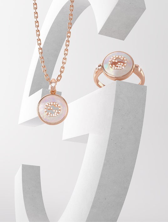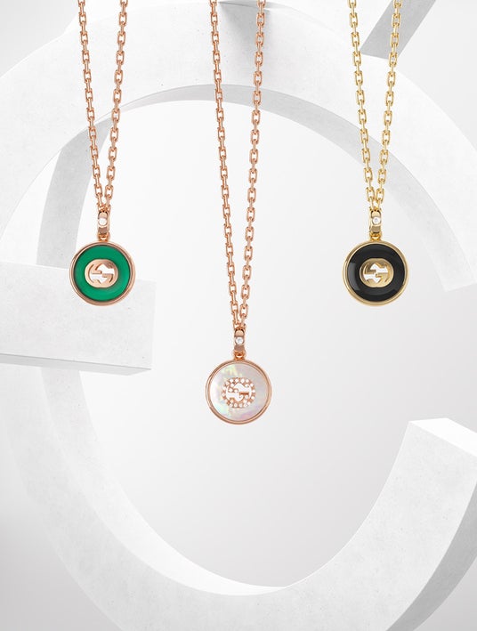 (C) Gucciこのコレクションは、オニキス、グリーンアゲート、マザー・オブ・パールという3種類の異なるジェムストーンを用いた ジュエリーで構成されます。ブラックオニキスは深みのある気品と18Kイエローゴールドとのエレガントなコントラスト を生み出し、グリーンアゲートは18Kピンクゴールドにセッティングされた遊び心あふれるデザインとなっています。 3つめのマザー・オブ・パールは18Kピンクゴールドと組み合わせ、中央のモチーフ部分にダイヤモンドのパヴェが きらめく華やかなデザインです。