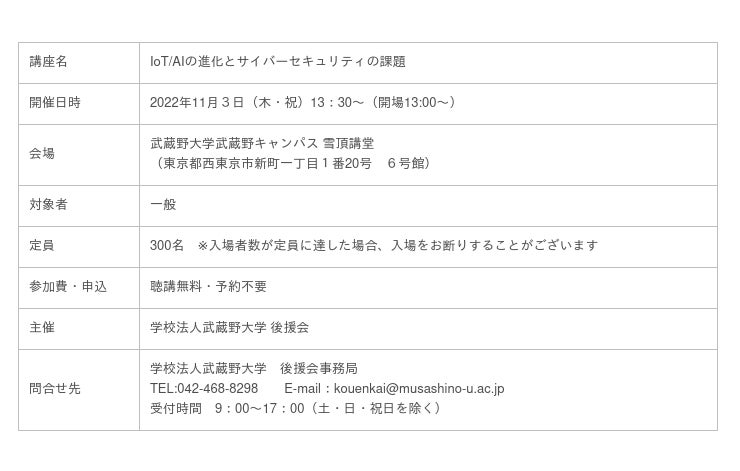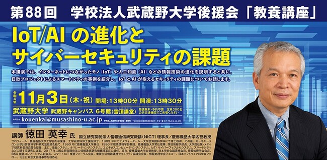 武蔵野大学後援会(東京都西東京市)は、2022年11月3日(木・祝)に教養講座 「IoT/AIの進化とサイバーセキュリティの課題」を武蔵野キャンパス雪頂講堂で開講します。本講座では、国立研究開発法人情報通信研究機構(以下、「NICT」)理事長/慶應義塾大学名誉教授 徳田 英幸氏が講師として登壇し、先端技術利用に伴う問題をサイバーセキュリティの観点から考えます。