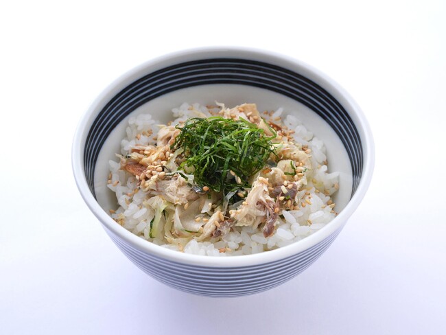 あたたかいご飯の上には、しょうがやマヨネーズなどで和えた塩鯖のほぐし身と刻み大葉をトッピングし、さっぱりとお召し上がりいただけます。