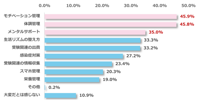 子どもの受験サポートをするにあたり、大変だと感じていることを質問したところ、最多回答は「「モチベーション管理(45.9%)」、次に「体調管理(45.8%)」、「メンタルサポート(35.0%)」と続きました。また、「大変だとは感じない」と回答した方は10.9%でした。
