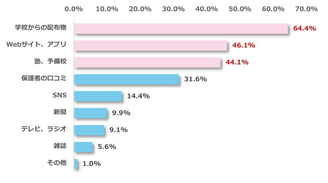 受験情報を取得する方法を質問したところ、最多回答は「学校からの配布物(64.4%)」、次に「Webサイト、アプリ(46.1%)」、「塾、予備校(44.1%)」と続きました。