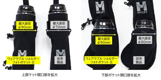 「OM SYSTEM × MILLET オリジナル ウェアラブル ショルダーフォトポケット II」 (左) 装着イメージ (右)