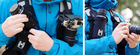 パックのショルダーハーネスに装着することで、交換レンズやアクセサリーを身体の前面に携行。バ