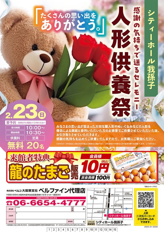 株式会社ベルコ大阪東支社 ベルファイン代理店は、2月23日(日)に「シティホール我孫子」にて『人形供養祭』を開催いたします。本イベントでは、多くの思い出が詰まった人形やぬいぐるみなどを、大切に供養することで、持続可能な社会への貢献を目指します。