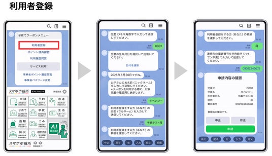 クーポン付与の対象となった住民は、LINE上から児童ID(利用者番号)と生年月日を入力して登録します。一般の方が登録してしまわないように、事前にインポートした児童のデータベース情報と照合し、本人確認ができると登録が完了します。