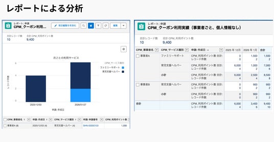 レポートでは、列の項目を増減したり、クーポン利用日を「今月」「先月」と絞り込むなどして、自治体の運用にあわせた柔軟なデータ活用ができます。