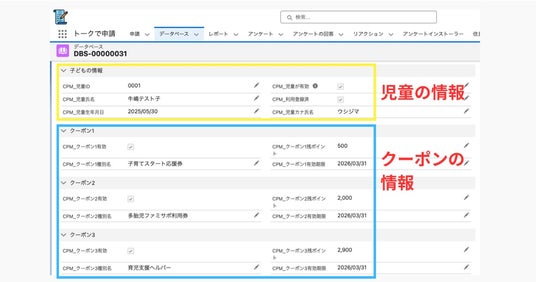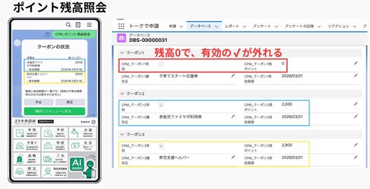 児童のデータベースには、クーポンの情報(種別、ポイント数、有効期限)をあらかじめCSVでインポートしておくことで、利用者登録した直後からクーポンを利用できます。