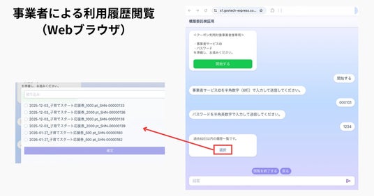 事業者は、LINE上またはWebブラウザから、サービスIDとパスワード(変更可能)で認証の上、利用履歴を閲覧します。
