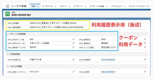 日付に加え時間を表示する、クーポンを共有している場合は続柄を表示する、期限を定めず閲覧可能として兄・姉の時に利用した事業者を確認できるようにする、など事業の特性に合わせた設定をします。