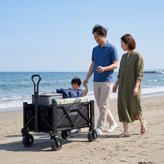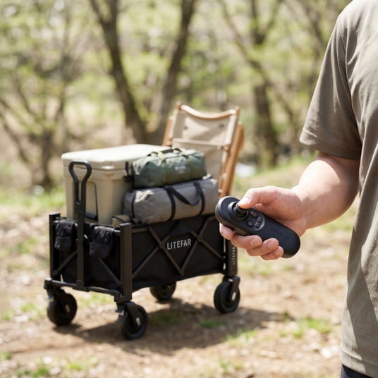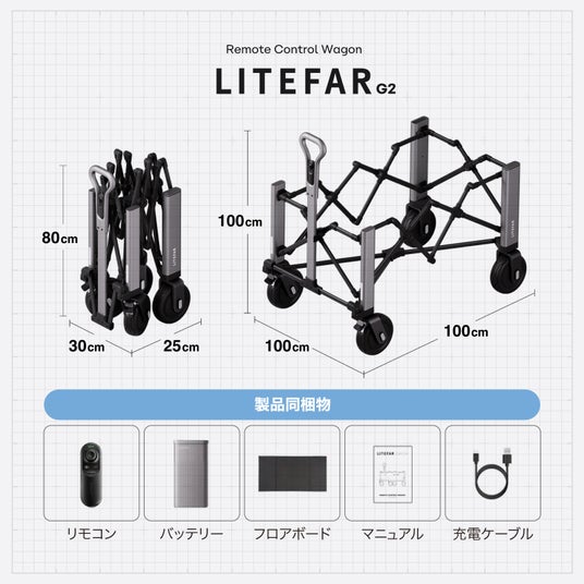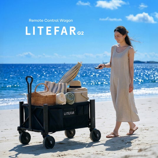 「ハンズフリー走行×リモコン操作」という、従来のアウトドアにはなかった全く新しい体験を実現したLITEFAR G2。ハンドルを握ってスイッチを押したり、引っ張って方向転換したりする従来の手動操作を覆し、ワンタッチで簡単に使いこなせるスマートキャリワゴンです。