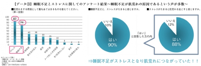 肌荒れの原因についてのアンケートを実施したところ、睡眠不足はストレスに続いて第2位となっており、更に90%以上が睡眠不足がストレスに繋がると感じている為、睡眠不足と肌荒れには密接な関係があると考えられます。 【データ3.】また、睡眠不足から発生するストレスは皮膚温を下げてしまい、肌のバリア機能を低下させ肌荒れになってしまうこともあります。また6月より気温が高くなることで87%が、気温が高くなると「冷たい飲み物を飲んでしまう」と回答していますが、それによって体が冷えて寝つきが悪くなってしまうだけでなく、末梢神経が収縮してしまい皮膚温が下がることで肌荒れを招いてしまうこともあるのです。【データ4.】これからの季節は「日照時間」と「生活習慣」をポイントに、この時季に起こりうる睡眠不足を解消し肌荒れを防ぎ美肌を目指しましょう。