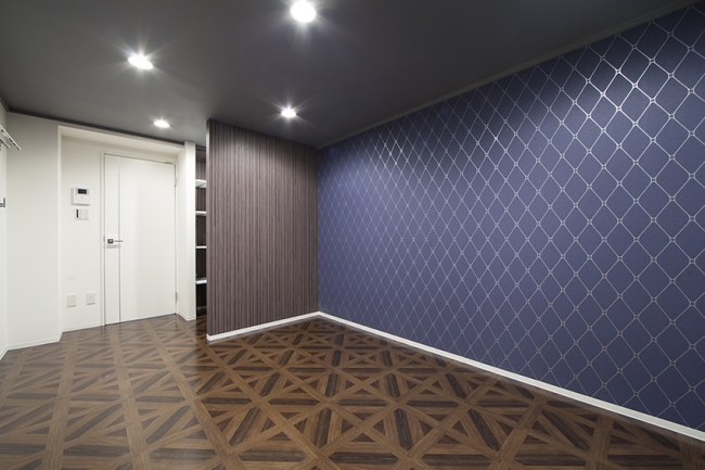 「Renotta」では、一部屋一部屋に独自のコンセプトを設定し、住む人の個性に合うように、「一戸一絵のリノベーション」を行っています。今回、新たに「Renotta」に誕生した「HANDSOME LIFE」は、大胆なダイヤ柄のフロアタイルに、濃紺のレザー調クロスと木目調の壁が特徴的なお部屋です。天井にグレーを取り入れることで、全体をモダンな雰囲気に仕上げました。ひときわ目立つショップのようなデザインで、見た目も暮らしもかっこよさを追求した居室となっております。