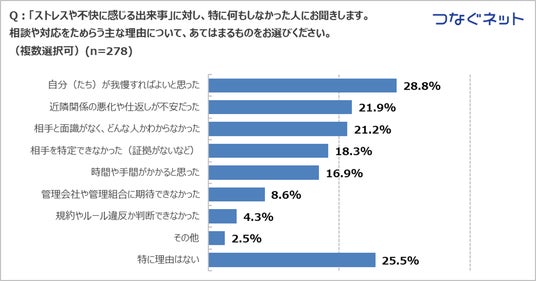 - 何もしない理由は「我慢すればよい」28.8%、「関係悪化が不安」21.9%、「相手の素性が分からない」21.2%が上位