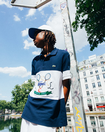 ルイーズ・トロッターとそのチームは競技の世界とそのドレスコードに着想を得て、スポーツシーンに根を下ろした素晴らしい2022年コレクションを創り出しました。襟、袖、ショーツの上部にはストライプが施され、コート内外でのシルエットにスタイルと動きを与えています。スポーツクラブを表す紋章はモダナイズされ、ラコステのファッションスポーツスタイルに特有の優雅さを加味しています。一方、カラーパレットはラコステのDNAに忠実です。晴れた日のローラン・ギャロスでのくつろぎのひとコマのように、原色とより淡い色味との組み合わせが新しさを与えています。