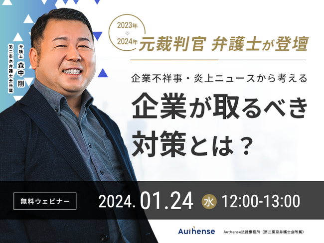 Authense法律事務所(東京都 港区)は、1月24日(水)に「元裁判官 弁護士が登壇 2023年の企業不祥事・炎上ニュースから考える 2024年に企業が取るべき対策とは?」と題したウェビナーを開催いたします。今回は、当事務所の元裁判官で、数多くの大企業や公的企業の顧問実績を持つ森中 剛弁護士が、豊富な顧問経験を活かして、多面的かつ実践的な観点で企業不祥事を解説いたします。