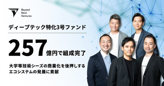 Beyond Next Ventures株式会社(本社:東京都中央区、代表取締役社長:伊藤毅、以下「当社」)は、2023年3月に設立した3号ファンド(正式名称:Beyond Next Ventures3号投資事業有限責任組合)を、当初の目標金額を上回る257億円でファイナルクローズしたことをお知らせします。3号ファンドは、金融機関や事業法人に加え、複数の運用受託機関及びファンド・オブ・ファンズ(FOF)からもご出資をいただき、当社ファンドの最終投資家層を年金や大学を含む幅広い機関投資家に拡大することができました。3号ファンドの組成完了により、ファンド運用総額は約480億円にまで拡大しました。