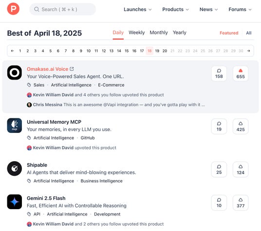 接客AIエージェントを提供する株式会社ZEALS(本社:東京都目黒区/米国拠点:サンフランシスコ、代表取締役:清水正大、以下「ジールス」)は、当社が開発・提供する音声接客AIエージェント「Omakase.ai Voice」が、2025年4月18日(現地時間)の「Product Hunt」にて、Google Gemini 2.5 Flashなどの先進プロダクトを抑えてデイリーランキング世界1位を獲得したことをお知らせいたします。