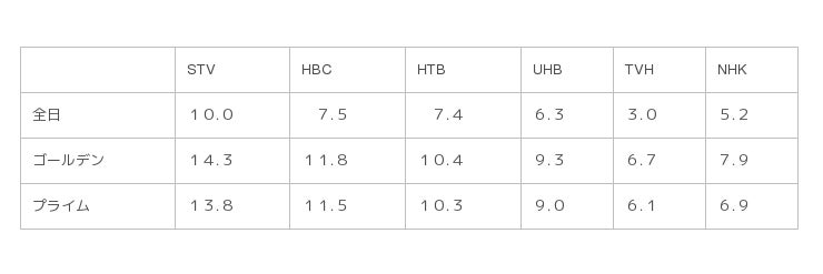 札幌地区の2018年「年度」視聴率が確定し、STV(札幌テレビ放送)は「全日」「ゴールデン」「プライム」の3部門でトップとなり、11年連続3冠を単独で達成しました。