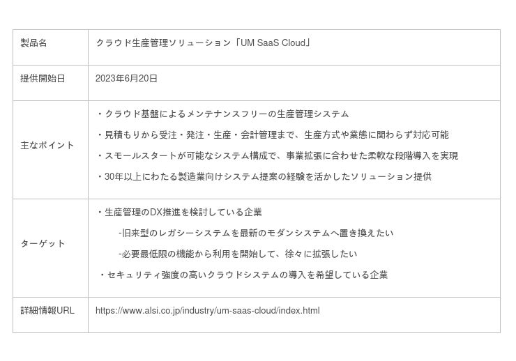 アルプス システム インテグレーション株式会社(本社:東京都大田区、代表取締役社長:永倉 仁哉、以下ALSI〔アルシー〕)は、このたび株式会社シナプスイノベーション(本社:大阪府大阪市、代表取締役社長 藤本 繁夫、以下シナプスイノベーション)と、クラウド生産管理ソリューション「UM SaaS Cloud(ユーエム サース クラウド)」の販売パートナー契約を締結し、6月20日より提供を開始することをお知らせいたします。