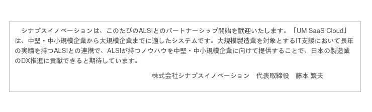 今回のパートナー契約およびALSIでのUM SaaS Cloud提供開始に際して、シナプスイノベーションから次のエンドースメントをいただきました。