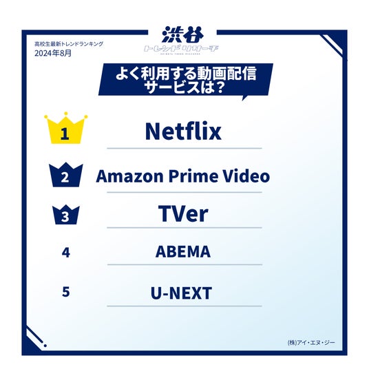 1位は「Netflix」が入選。「Netflix限定の映画とドラマが面白いから」(高3・女子)など、Netflixでしか視聴できないオリジナルドラマや恋愛リアリティーショーが人気のようです。また、「親子で入会しているから」(高2・男子)という声も多く寄せられました。2位に「Amazon Prime Video」がランクイン。映画やドラマの配信に加えて「アニメがたくさんあるから」(高3・女子)などのアニメの種類が豊富な点が魅力のようです。3位には、「TVer」が選ばれました。「見逃した番組が見られるから」(高3・女子)といったコメントも多数散見され、若年層のテレビ離れが叫ばれはじめて久しいが、話題のドラマや人気のバラエティ番組はTVerの1週間以内の見逃し配信できちんと視聴している高校生が多い様子がうかがえます。