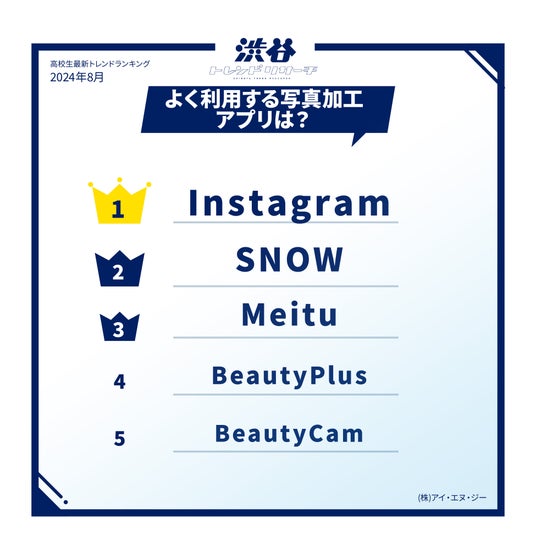 1位は「Instagram」が選ばれました。「アプリが元から入っているので使いやすいのと、加工が強すぎないフィルターが多くていい。」(高1・女子)といった意見が寄せられ、手軽さと豊富なフィルターを無料で使用できることが人気の理由のようです。2位は「SNOW」。細かく加工ができる機能に加えて「どのフィルターも安定して盛れるし自分好みでフィルターを作れたり編集できるから」(高2・女子)などといったフィルターに関するコメントが多く寄せられ画像加工アプリの中でもロングセラーアプリとして人気を誇っています。3位は「Meitu」。顔や体の細かな加工を行うのに利用しやすい点が人気のようでプリクラの上から更に加工を行う“追い加工”に利用しているようです。
