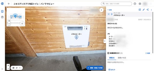 360°カメラで撮影した施設内のパノラマ画像と図面を連携させることで、現場に行かなくても現地の状況を直感的に把握できます。これにより、現場への移動時間や往訪回数を大幅に削減し、迅速な状況判断と対応指示を可能にします。従来の運用と比較して、現場確認に伴う工数を約3分の1削減できることが期待され、業務効率化と対応コストの低減に寄与します。