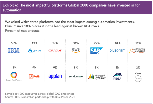 HFS Research社は、コロナ禍後の事業目標に向けた自動化の改善ニーズの把握を目的として、グローバル2000企業の上級管理職200名を対象にアンケート調査と面談を実施しました。自動化の取り組みに最大の影響を与えたプラットフォームについて質問したところ、回答者の18%がBlue Prismのインテリジェントオートメーションプラットフォームを選択しており、他のRPAベンダーを大きく上回りました。