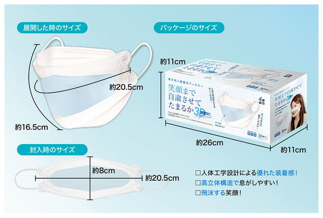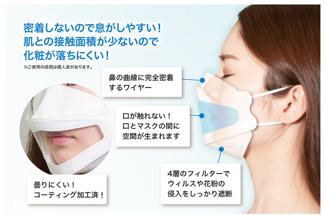 高性能4層構造フィルター使用で口が触れない高立体だから、呼吸がしやすくメガネがくもりにくい。さらには、肌との接触部分が少ないためメイクも崩れにくく、個別包装なので衛生的で持ち運びにも便利です。