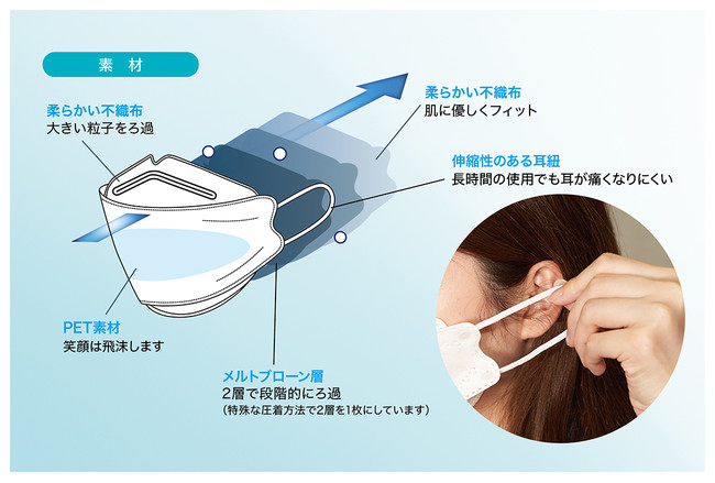 高性能4層構造フィルター使用。立体構造で息がしやすい、対面機会の多い方にピッタリな3Dマスク