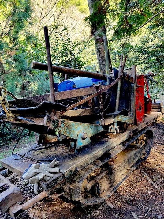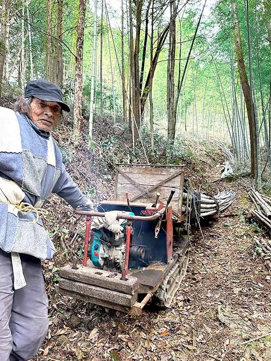 冬の澄んだ空気の中、「ガタガタガタ!ゴトゴトゴト」という竹運搬機の音が静かな虎竹の里に響きます。晩秋から1月下旬にかけての虎斑竹伐採シーズン、険しい山道を軽やかに下ってくるのは熟練の山職人です。伐採直後の虎斑竹は水分を多く含んでおり、一本を持ち上げるだけでも大変な重さですが、彼は経験と鍛錬に支えられています。農業用の機械を改良した竹運搬機を使用し、急斜面をエンジンブレーキを効かせて後ろ向きに慎重に下ります。こうして伐採された竹材が、工場へと運ばれ、さらなる工程を経てその真価を発揮することとなります。