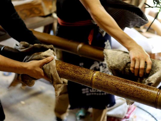 伐採後、竹は「油抜き」という工程を経て耐久性を高め、表面のツヤを引き出します。この作業では700度のガスバーナーの熱が使用され、竹職人は竹の個性や太さ、乾燥具合を見極め、絶妙なタイミングで炎に差し入れます。この手間ひまをかけることで、竹から余分な油分が抜かれ、竹の輝きと耐久性が高まります。