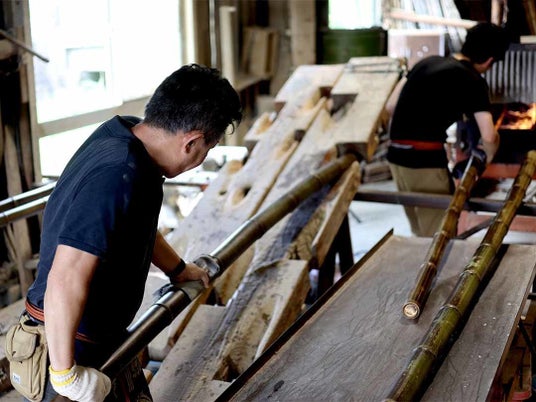 続いて行われる「矯め直し」では、油抜き後の熱を利用し、一本一本の竹の曲がりを職人が丁寧に矯正します。竹は自然の産物であるため、真っ直ぐなものは一本として存在しません。この工程により、竹細工にふさわしい竹材へと仕上げられ、さらなる加工が可能となります。