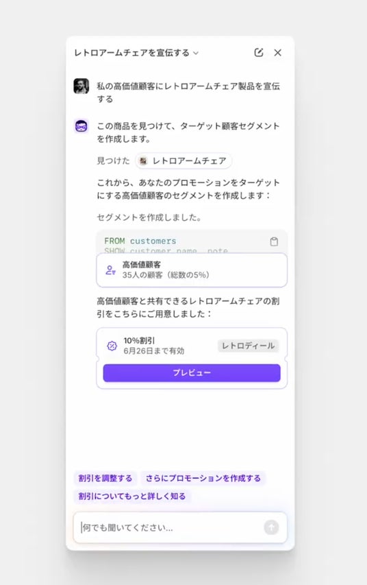 最新のAI技術によって開発されたSidekickは、事業者にとって信頼できる「仮想の共同創業者」のような存在として機能します。Shopifyのプラットフォームに関する深い知識と、各事業者のストアデータを組み合わせることで、自然な対話を通じて、各事業者の状況に即した具体的な提案やアドバイスを提供します。事業者は、ビジネスデータの即時分析やSEOを意識した商品説明の改善、日常業務の自動化、そしてより的確な意思決定まで、日々の業務フローの中でスムーズに実行することが可能です。