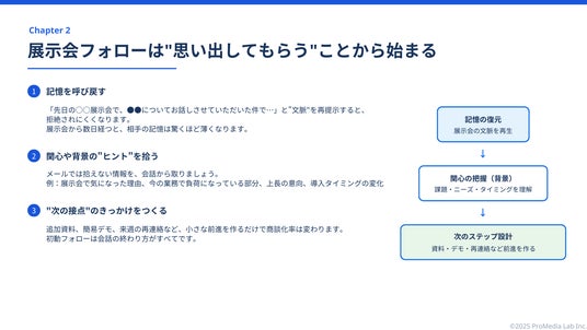株式会社プロメディアラボ(本社:東京都中央区、代表取締役:廣瀬義憲)は、展示会後のフォロープロセスを体系化した新資料『展示会フォローの「正しいやり方」 ―商談につながる“初動から再アプローチまで”―』を公開しました。