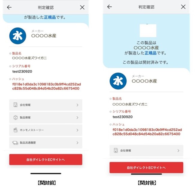 真贋判定システムHyperJ.aiの「開封通知機能」は、商品が未開封であるか、開封されたのはいつかを確認することができます。これにより、製造者・生産者から送られて商品購入者まで届けられたものが、実際の商品と異なる別のものに差し替えられたり、異物等が混入したりしていないことを保証することができます。商品購入者・最終消費者にとっては、購入商品に対する安心感が増し、ブランド力が高まるという効果があります。製造者・生産者にとっては、商品購入者が、いつ商品を消費、使用したかを確認することができ、消費期限などの確認や、消費行動の詳細な分析を通じて、マーケティングに活用することができます。