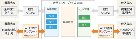 今回、上記の知見を持つ両社が、WEB受注・購買テンプレートと大臣エンタープライズを連携させることにより、全国の中堅・中小の製造・卸売業の企業に対し、大臣エンタープライズで企業間の受発注のやり取りをWebブラウザ上でリアルタイムに行うことができるサービスの提供を開始します。